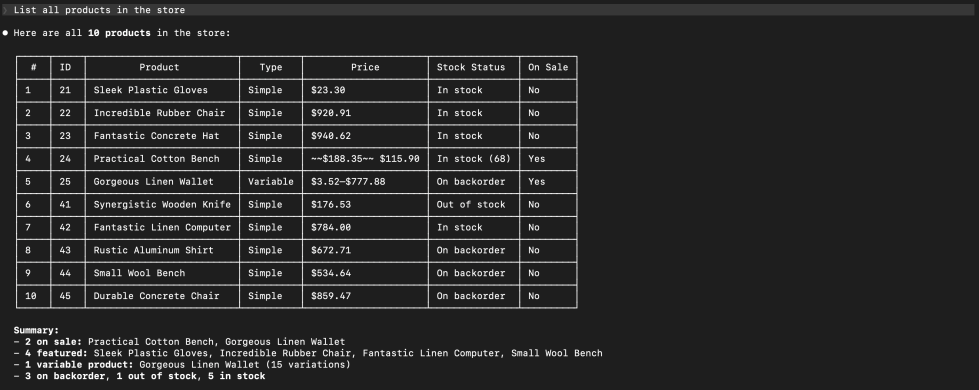 So when we say, “List all products under USD,” MCP translates that into something WooCommerce understands, runs it securely, and brings back the results.