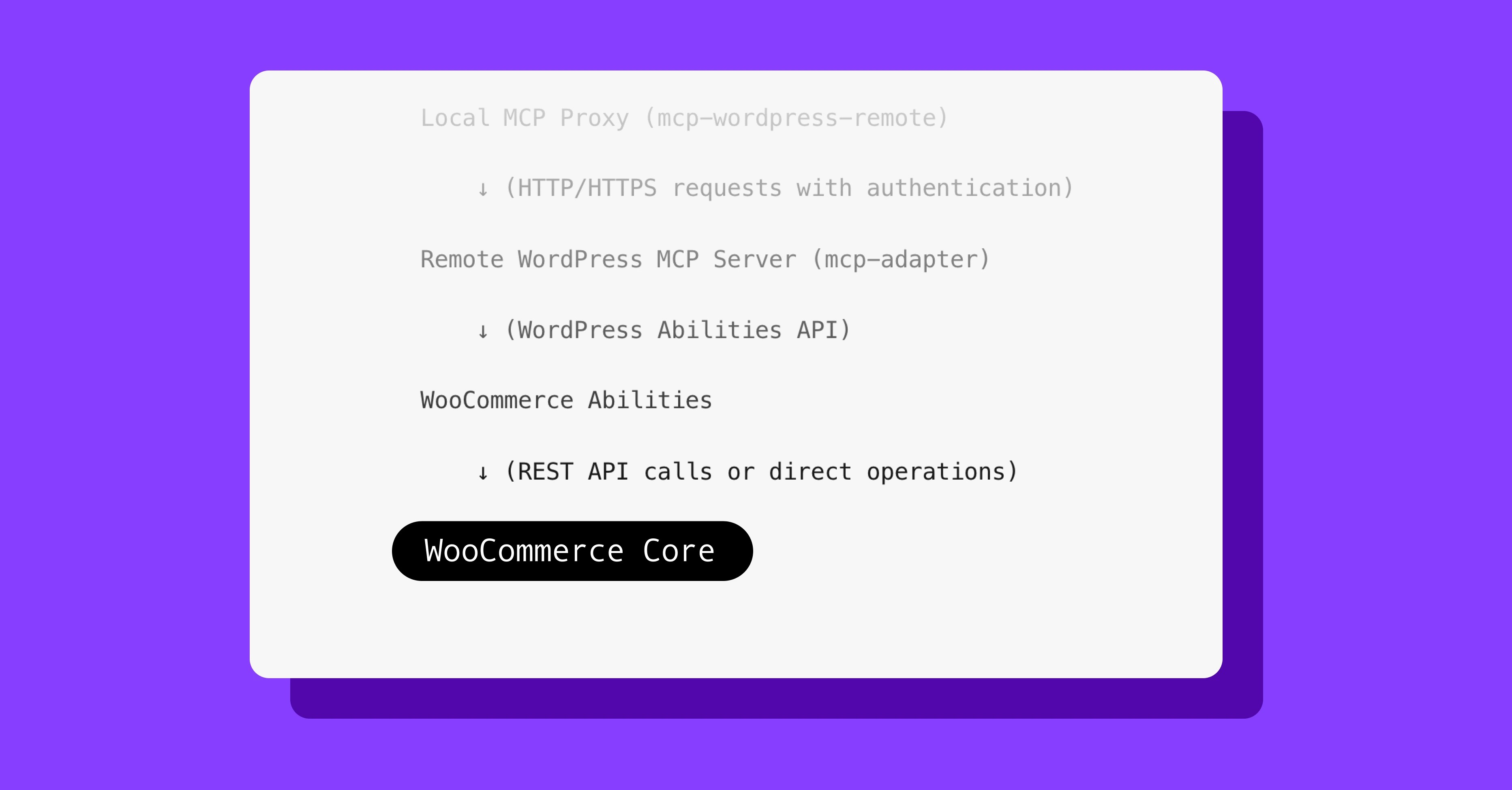 MCP landed as a beta in WooCommerce 10.3 with product and order Abilities. The update since then was the MCP Adapter v0.3.0 migration in 10.4, which updated the transport layer. Since then, the MCP surface has been stable through 10.5, 10.6, 10.6.1, and 10.7, which is what we’re building on.