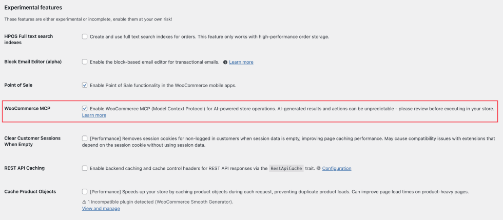 Option 1: Head over to WP Admin > WooCommerce > Settings > Advanced > Features and enable WooCommerce MCP.